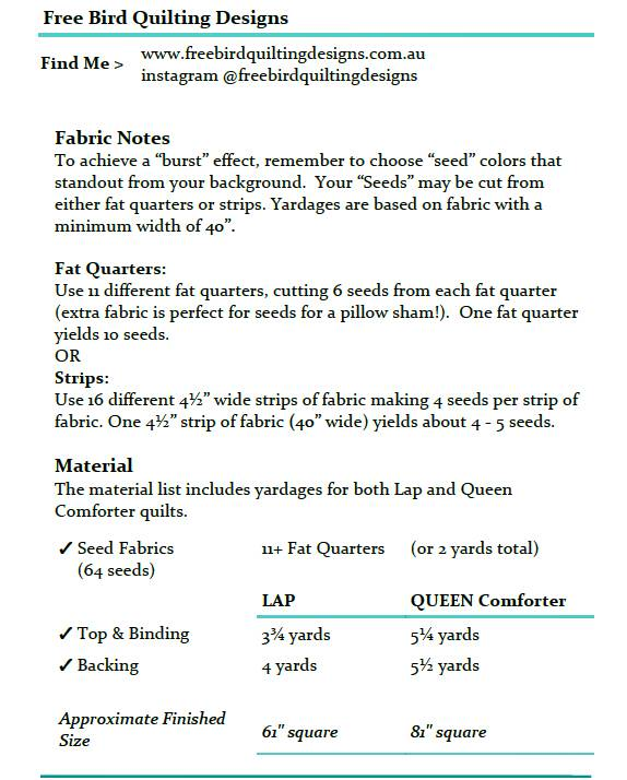 This quilt uses 21 brightly coloured fabrics and cut 3 seeds per colour, 4 for one colour, arranging them around the seed burst pattern to give a good balance of colour and light and shade.