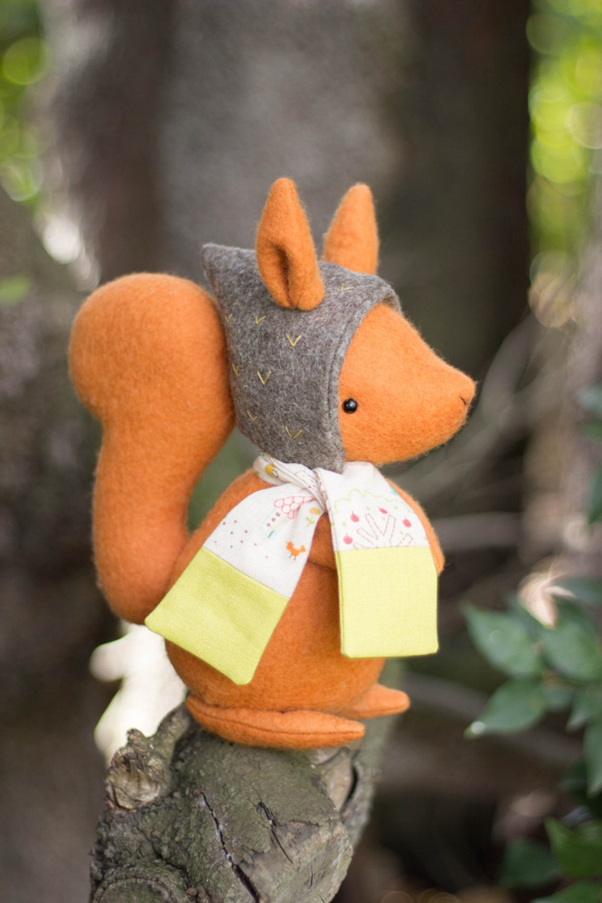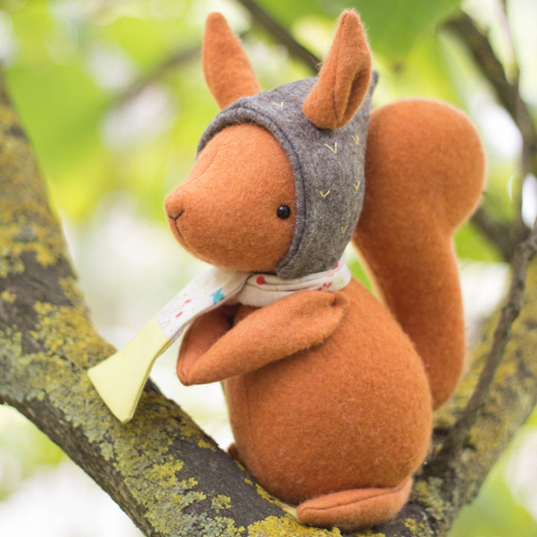 100% wool felt squirrel with felt acorn hood and fabric scarf.